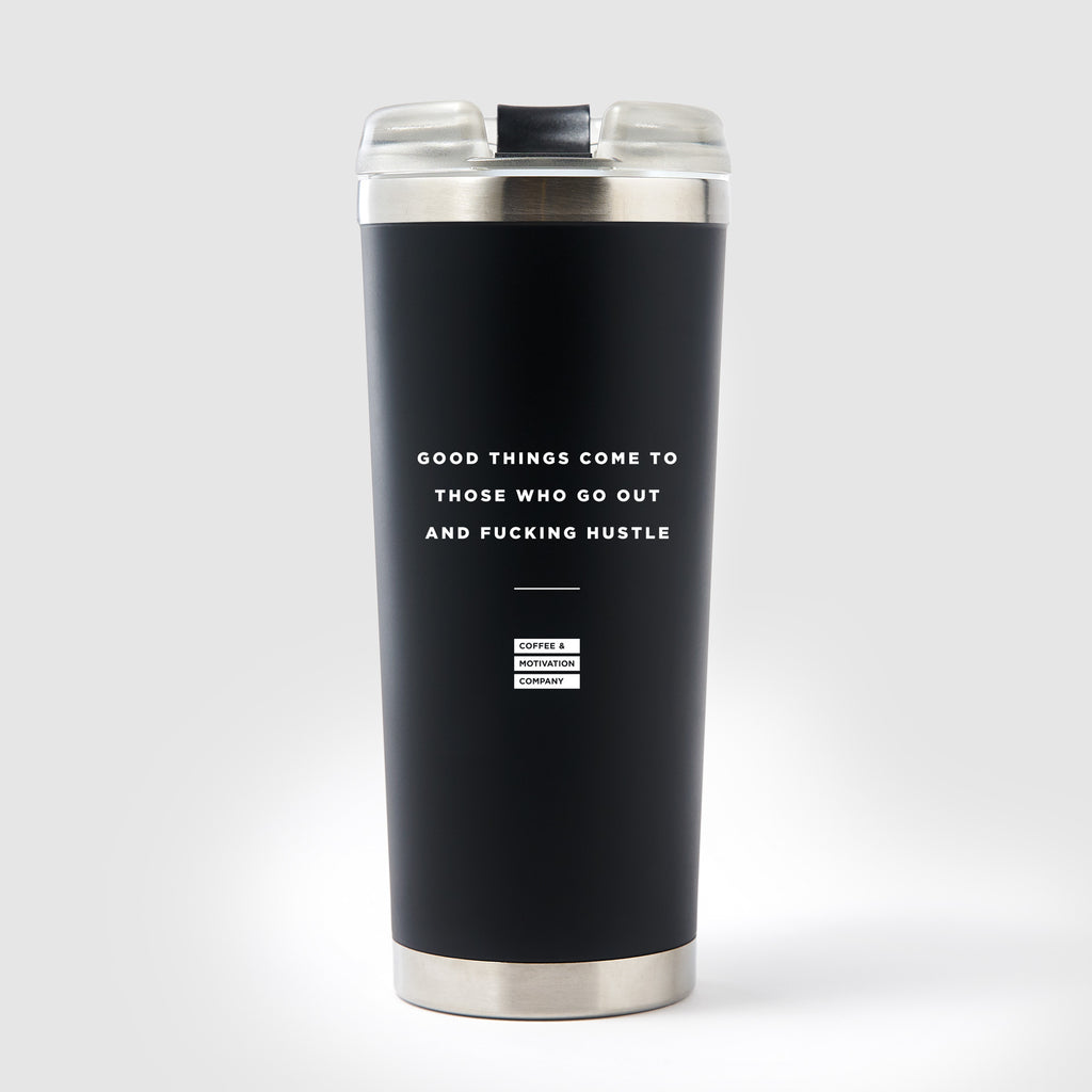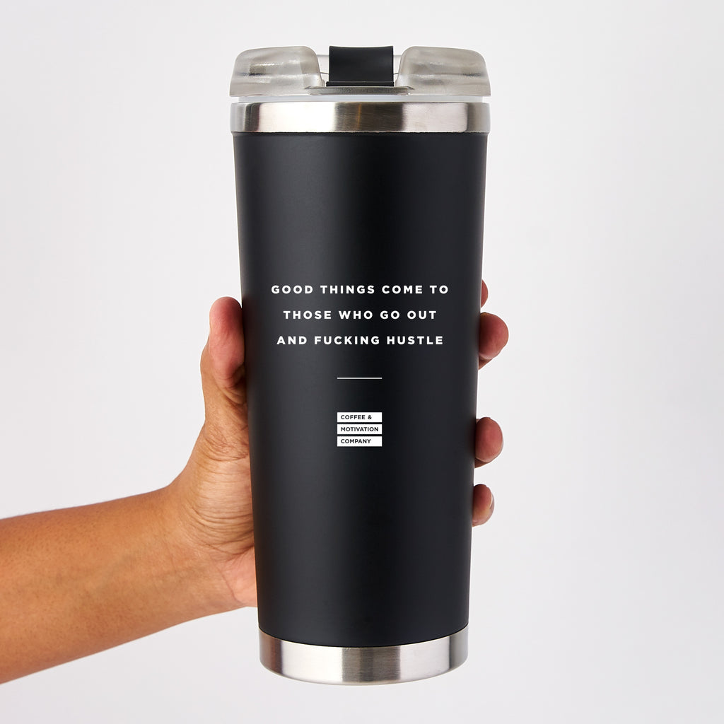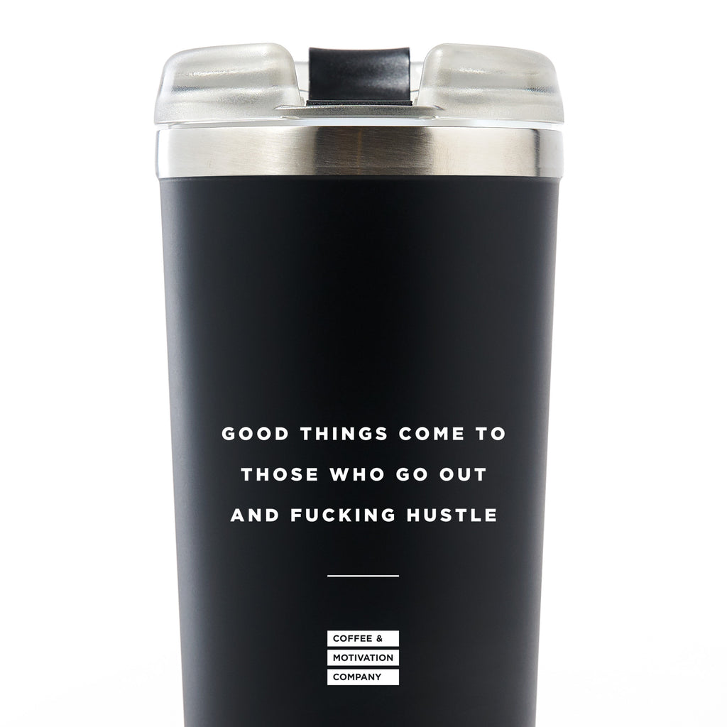 - Get your morning coffee on the go with a dose of motivation with the following quote “Good Things Come to Those Who Go Out and Fucking Hustle"